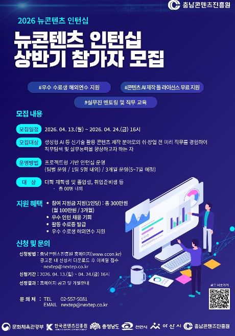 ![[충남콘텐츠진흥원] 충남콘텐츠진흥원, ‘2026 뉴콘텐츠 인턴십’ 상반기 참가자 모집 보도자료](/data/photos/portnews/202604/20260414111801-34443.jpg)