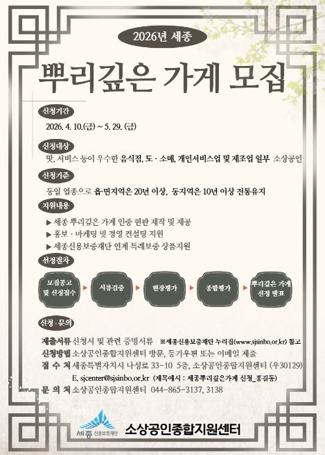 뿌리 깊은 가게로 선정된 업체에는 ▲인증 현판 제공 ▲홍보 지원 ▲맞춤형 경영 컨설팅 ▲세종신용보증재단의 소상공인 특별자금 심사 우대 등 행·재정적 지원을 받을 수 있다.