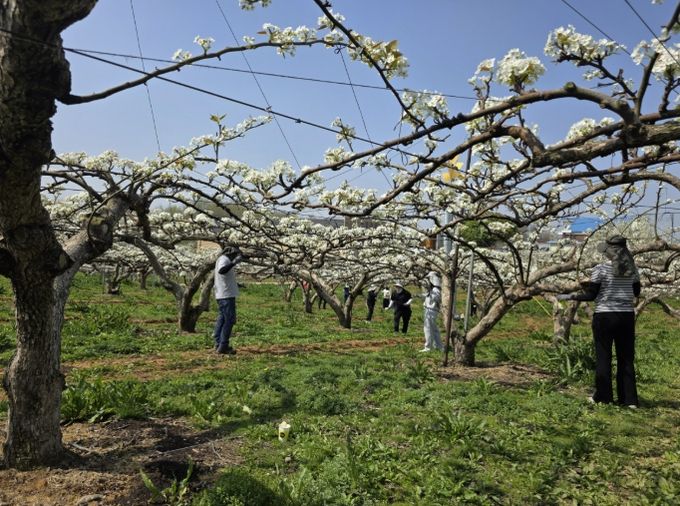 배 화접은 기계화가 어려워 사람의 손길이 일일이 필요한 작업으로, 제때 수분이 이루어지지 않을 경우 한 해 농사를 망칠 수 있어 농가 입장에서는 가장 인력이 절실한 시기다.