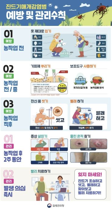 포천시보건소 관계자는 “농작업과 야외 활동이 많은 계절인 만큼 진드기 노출 위험이 높아질 수 있다”며 “시민 여러분, 특히 농업인 등 고위험군은 예방수칙을 철저히 지켜주시고, 진드기에 물린 뒤 발열 등 의심 증상이 있으면 신속히 의료기관을 방문해달라”고 말했다.