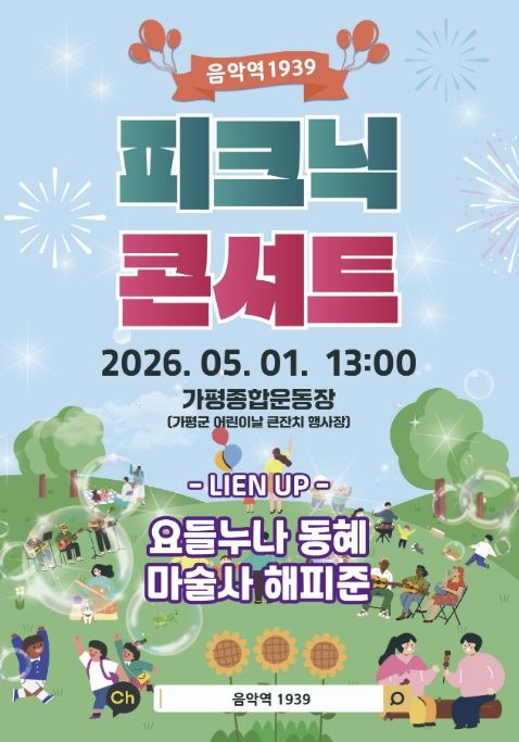 가평군은 오는 5월 1일 오후 1시 가평종합운동장에서 ‘피크닉 콘서트’를 개최한다고 밝혔다. 이번 공연은 ‘제15회 가평군 어린이날 큰잔치’의 축제 분위기를 조성하고, 주민들에게 야외 휴식 공간에서 즐기는 문화 향유 기회를 제공하기 위해 기획됐다.