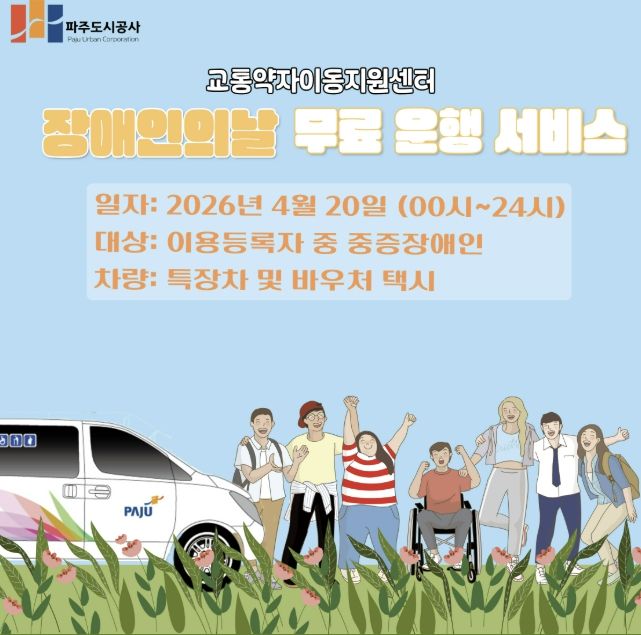 (중부시사신문) 파주도시공사 교통약자이동지원센터에서는 오는 4월 20일 장애인의 날을 맞아 교통약자를 위한 무료 운행 서비스를 실시한다.