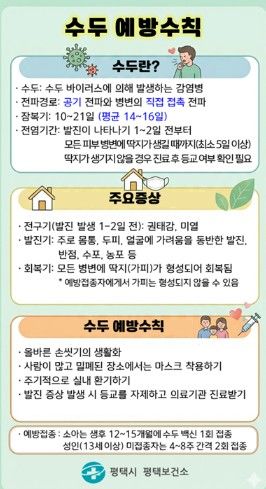 평택보건소 관계자는 “수두는 어린이집, 유치원, 학교 등 집단시설에서 쉽게 전파될 수 있어 가정과 시설의 적극적인 협조가 중요하다”며, “지속적인 감염병 발생 동향 모니터링과 예방 홍보를 통해 시민 건강 보호에 최선을 다하겠다”고 밝혔다.