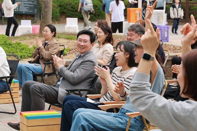 김중혁 작가의 북토크와 강예영·채비의 아임버스커 공연도 큰 호응을 얻었다. 이 시장은 ‘행복’을 주제로 한 강예영씨의 공연을 지켜보며 박수를 보냈다.