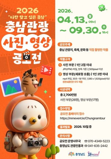 주요 홍보 내용은 △시군별 대표 축제 및 체험형 관광 프로그램 △2025∼2026년 충남 방문의 해 △2026 태안국제원예치유박람회 △충남 대표 관광명소 및 계절별 추천 여행지 △자연·휴식·미식 관광자원 등이다.