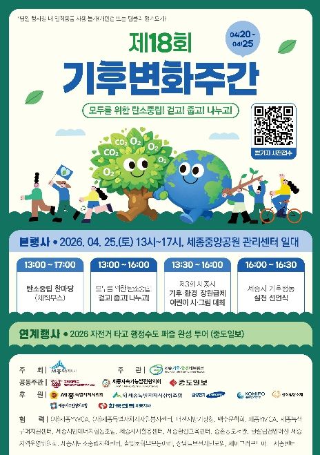 (중부시사신문) 세종특별자치시가 20일부터 25일까지 6일간 중앙공원 일대에서 ‘제18회 기후변화주간’ 행사를 개최한다.