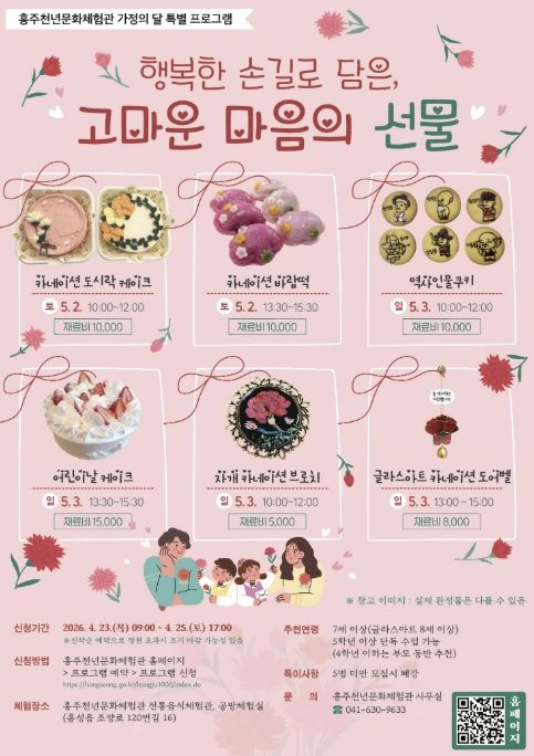(중부시사신문) 홍성군 홍주천년문화체험관은 가정의 달을 맞아 오는 5월 2일부터 3일까지 이틀간 특별 프로그램 “행복한 손길로 담은 고마운 마음의 선물”을 운영한다.