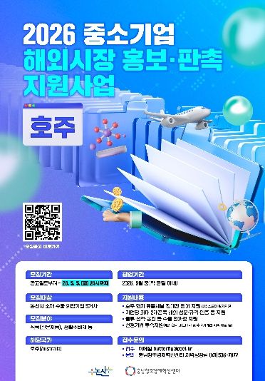 (중부시사신문) (재)충남창조경제혁신센터는 2026년 중소기업 해외시장 홍보판촉 지원 사업에 참여할 논산소재 수출 기업을 오는 5월 5일까지 모집한다고 밝혔다.