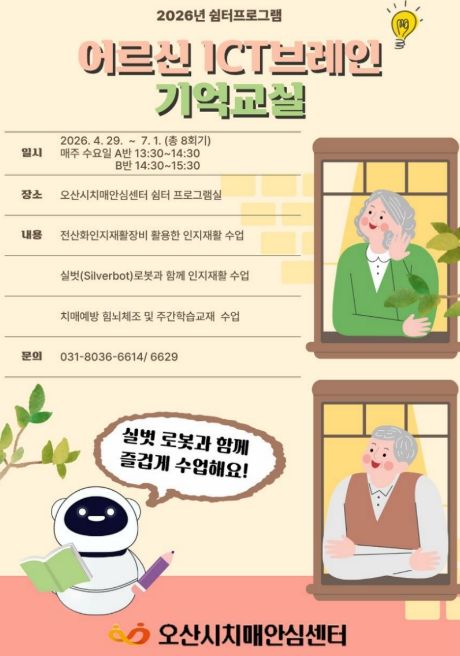 (중부시사신문) 오산시치매안심센터는 오는 4월 29일부터 경증 치매환자를 위한 쉼터 프로그램 ‘ICT 브레인 기억 교실’을 운영한다고 밝혔다.