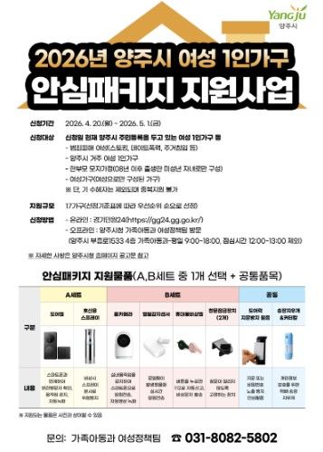 (중부시사신문) 양주시는 관내 여성 1인 가구 등 범죄 취약 여성 가구의 안전한 일상을 지원하기 위해 ‘2026년 양주시 여성 1인 가구 안심패키지 지원사업’을 추진한다.