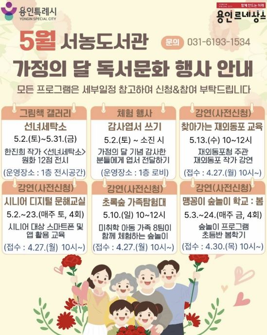 (중부시사신문) 용인특례시 서농도서관은 오는 5월 가정의 달을 맞아 다양한 세대를 아우르는 프로그램으로 이뤄진 ‘2026년 5월 독서문화행사’를 마련했다고 21일 밝혔다.