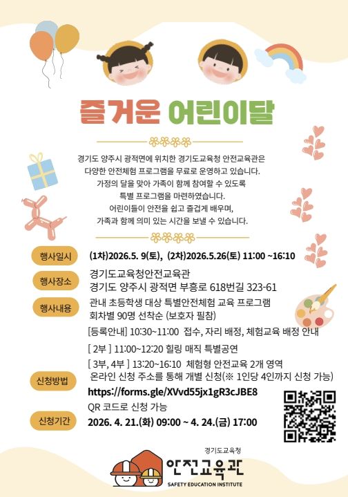 (중부시사신문) 경기도교육청안전교육관이 가정의 달을 맞아 가족이 함께 참여해 안전의 중요성을 쉽고 즐겁게 배울 수 있도록 ‘가정의 달 안전교육 특별 프로그램’을 운영한다.