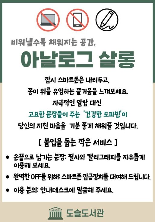 이충미 도솔도서관장은 “이번 프로그램을 통해 시민들이 디지털 기기와 잠시 거리를 두고, 깊이 있는 독서와 손글씨 쓰기를 통해 문해력을 향상시키는 계기가 되길 바란다”며 “지역사회의 지속가능한 아날로그 독서 문화를 정착시키는 구심점이 될 수 있도록 노력할 것”이라고 말했다.