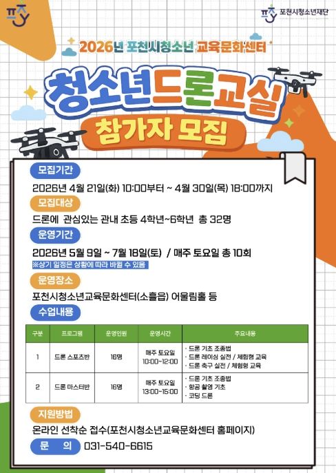 (중부시사신문) (재)포천시청소년재단 포천시청소년교육문화센터는 오는 4월 21일부터 30일까지 관내 초등학교 4학년부터 6학년을 대상으로 청소년드론교실 1기 참가자를 선착순으로 모집한다고 밝혔다.