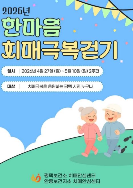 (중부시사신문) 평택보건소 치매안심센터와 안중보건지소 치매안심센터에서는 지역 주민의 치매 예방과 인식개선을 위해 녪년 한마음 치매극복 걷기 행사’를 오는 4월 27일부터 5월 10일까지 2주간 진행한다.