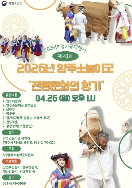 (중부시사신문) 양주시는 국가유산청의 지원을 받아 ‘제43회 양주소놀이굿 정기공개행사’를 오는 26일 오후 1시, 양주소놀이굿 전수교육관 공연장에서 개최한다고 밝혔다.