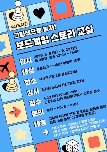 (중부시사신문) 고양특례시 식사도서관이 오는 5월 9일부터 공공도서관 독서문화 프로그램 ‘그림책으로 놀자! 보드게임 스토리 교실’을 운영한다.