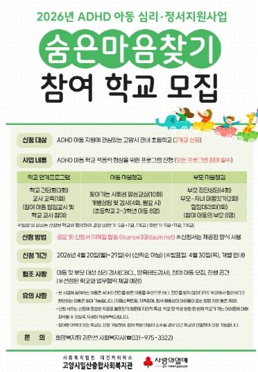 (중부시사신문) 고양시일산종합사회복지관은 ADHD 아동의 학교 적응을 돕기 위한 심리·정서지원사업 ‘숨은마음찾기’에 참여할 학교를 모집한다고 21일 밝혔다.