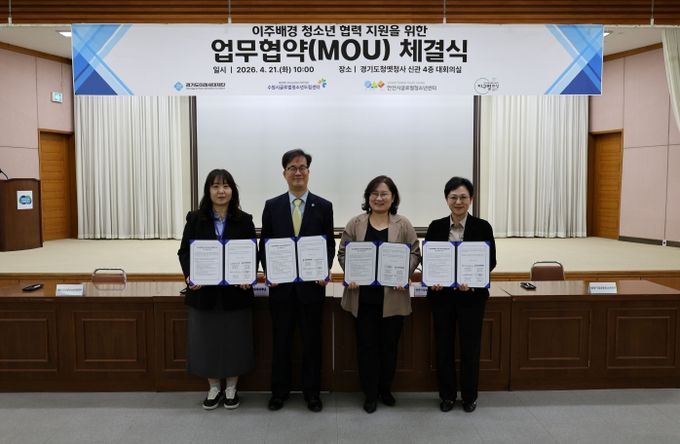 (중부시사신문) 경기도미래세대재단은 21일 수원시 팔달구 옛 경기도청사에서 수원시글로벌청소년드림센터, 안산시글로벌청소년센터, 화성시글로벌청소년센터와 이주배경 청소년 지원을 위한 업무협약을 체결했다.