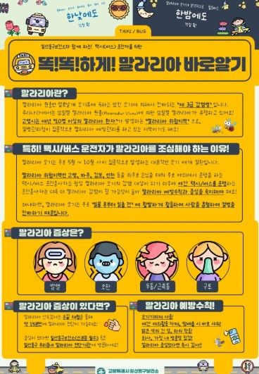 (중부시사신문) 고양특례시 일산동구보건소는 말라리아 매개모기가 본격적으로 활동하는 시기를 대비해 택시와 버스 등 운전 종사자들을 대상으로 “똑!똑!하!게! 말라리아 바로알기”를 오는 5월부터 홍보할 예정이라고 밝혔다.