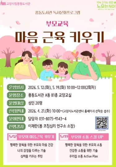 (중부시사신문) 고양특례시 풍동도서관은 오는 5월 독서문화 프로그램 ‘부모교육, 마음 근육 키우기’를 진행한다고 22일 밝혔다.