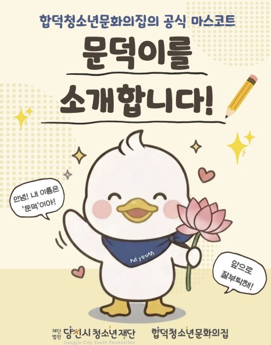 이현정 합덕청소년문화의집 관장은 “지역 청소년들의 참여로 만들어진 마스코트 ‘문덕’이가 합덕청소년문화의집의 새로운 활력이 될 것으로 기대하며 앞으로도 합덕청소년문화의집은 청소년들이 꿈을 키우고 소통할 수 있는 즐거운 공간이 될 수 있도록 최선을 다하겠다”고 말했다.