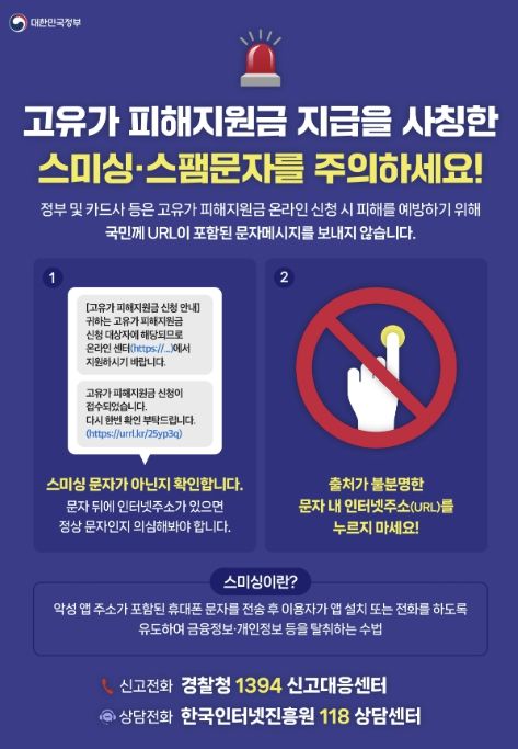 시에 따르면 정부 및 카드사 등 공식 기관은 지원금 신청과 관련해 링크(URL)가 포함된 문자를 발송하지 않는다. 다만, 1차 신청률 제고를 위해 1차 지원 대상자를 대상으로 URL이 포함되지 않은 안내 문자를 발송할 예정이다.
