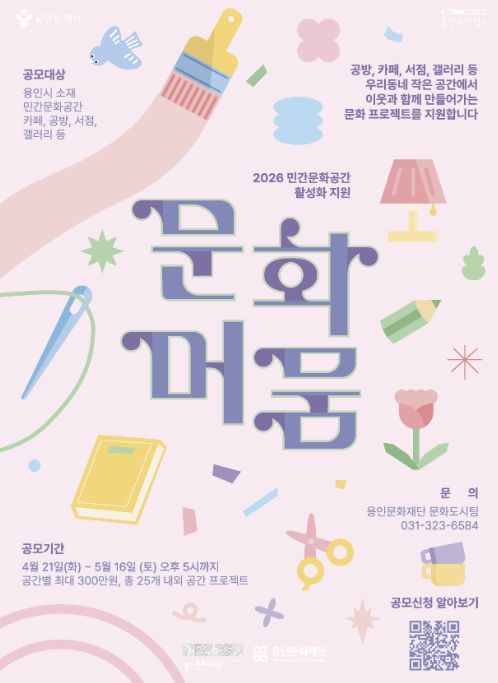 (중부시사신문) 용인문화재단은 오는 5월 16일까지 ‘민간문화공간 활성화 지원사업 '문화머뭄'’의 참여 공간을 모집한다고 밝혔다. 지난해 25개소 공간에서 203회의 프로그램을 운영하며 2,101명의 시민 참여를 이끌어낸 ‘문화머뭄’ 사업은 올해 재단 자체 재원을 매칭하여 총 25개소의 민간문화공간을 선정하고, 공간별 최대 300만 원까지 프로젝트 운영비를 지원할 예정이다.