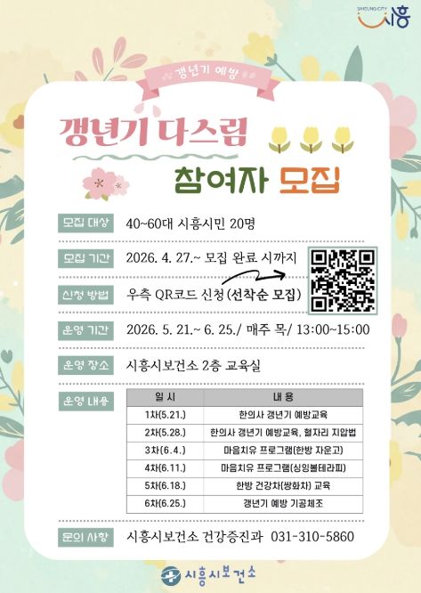 프로그램은 오는 5월 21일부터 6월 25일까지 매주 목요일 오후 1시부터 3시까지 총 6회에 걸쳐 시흥시보건소 교육실에서 운영된다. 주요 내용은 한의약 기반 갱년기 예방교육을 비롯해 혈자리 지압법, 마음치유 프로그램, 기공체조, 한방차 만들기 등으로 구성됐다.