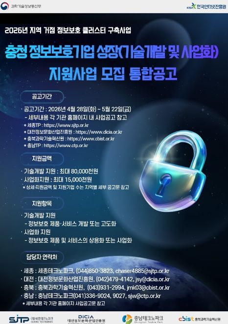 (중부시사신문) 세종테크노파크는 정보보호 유망기업 발굴 및 성장 지원을 위해 ‘정보보호 성장(기술개발 및 사업화) 지원사업’ 충청권 통합공고를 4월 28일부터 진행한다고 밝혔다.