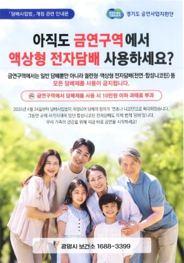 (중부시사신문) 광명시 보건소는 시민 건강을 증진하고 간접흡연 피해를 막기 위해 오는 5월 15일까지 ‘2026년 담배 정의 확대에 따른 금연구역 합동 점검·단속’을 한다.