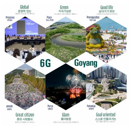 6G Goyang이란 △Global(경쟁력 있는) 대내외적 인지도를 가진 도시 △Green(지속가능한) 생태도시 △Great citizen(좋은 사람들의) 풍부한 인적자원을 가진 도시 △Good life(살아가기 편한) 도시기반을 갖춘 편익도시 △Glam(흥미로운) 역사·문화·관광·행사의 도시 △Goal oriented(스스로 만들어가는) 일과 생활이 함께하는 자족도시를 의미한다.