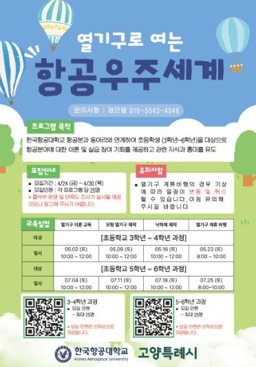 프로그램은 △열기구로 여는 항공우주의 세계 △패러글라이딩으로 여는 하늘 △천체관측 우주탐험 등 총 3개 과정으로, 초등학교 저학년(3~4학년)과 고학년(5~6학년)으로 나눠 운영된다. 각 과정은 한국항공대에서 주 1회씩 4주간 진행된다.