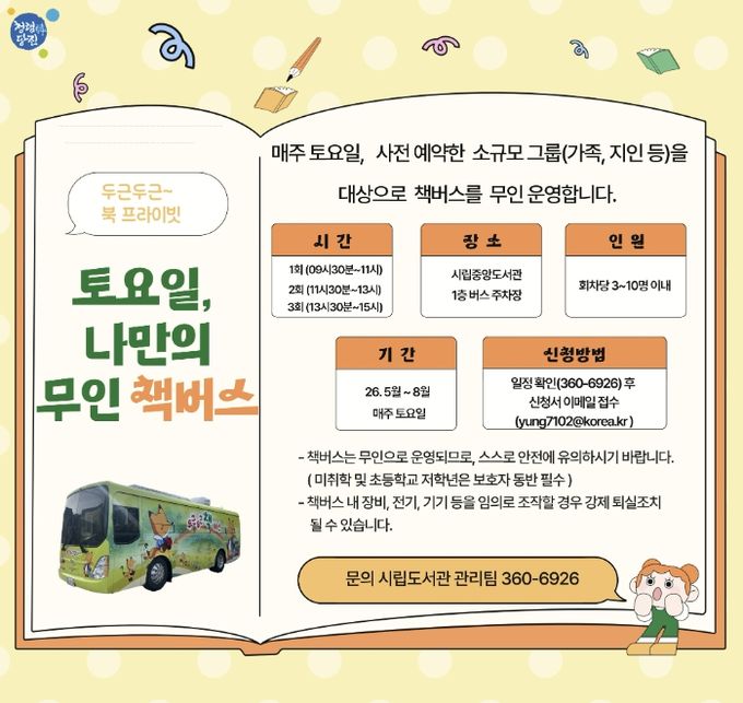 시립도서관 관계자는 “책버스가 단순히 책을 빌리는 공간을 넘어, 시민들에게 쉼과 여유를 주는 ‘우리 동네 아지트’ 같은 공간이 되길 바란다”며, “앞으로도 유휴 자원을 활용한 창의적인 문학 프로그램을 지속적으로 발굴해 나가겠다”고 전했다.