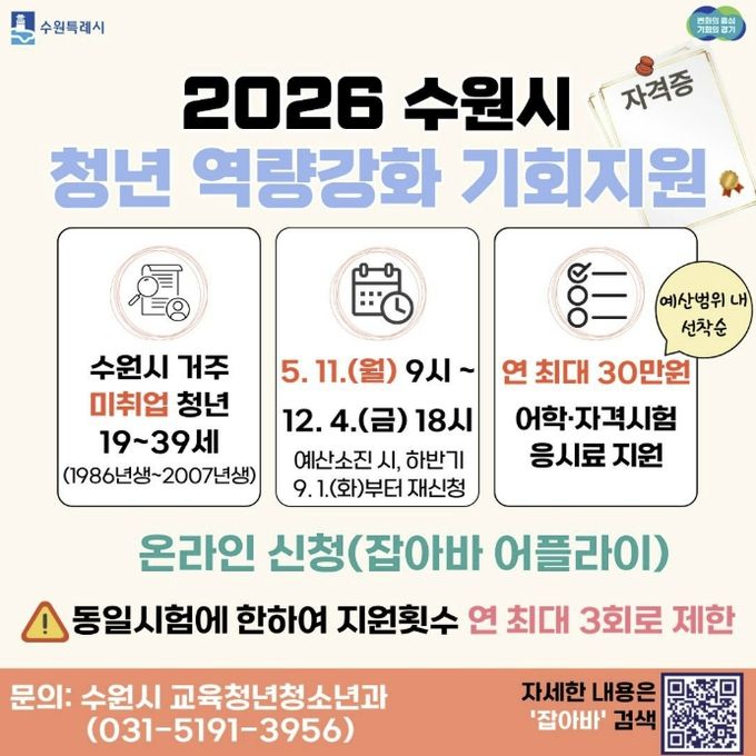 (중부시사신문) 수원특례시는 미취업 청년의 취업 준비 비용 부담을 덜어주는 ‘청년 역량강화 기회 지원 사업’을 12월 4일까지 운영한다. 미취업 청년에게 어학·자격시험 응시료를 1인당 연 최대 30만 원 지원한다.