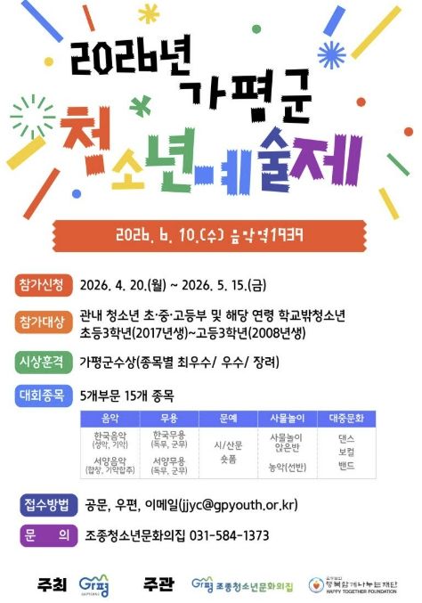 가평군 관계자는 “이번 ‘2026년 가평군청소년예술제’가 청소년들이 자신의 꿈과 재능을 발견하고 성장하는 소중한 기회가 되길 바란다”며 “지역 청소년들이 적극적으로 참여해 예술적 끼와 재능을 마음껏 펼치길 기대한다”고 말했다.