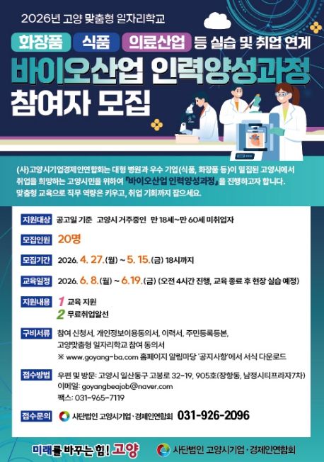 (중부시사신문) 고양특례시는 2026년 고양맞춤형 일자리학교 공모사업 중 ‘바이오산업 인력 양성과정’의 참여자를 모집한다.
