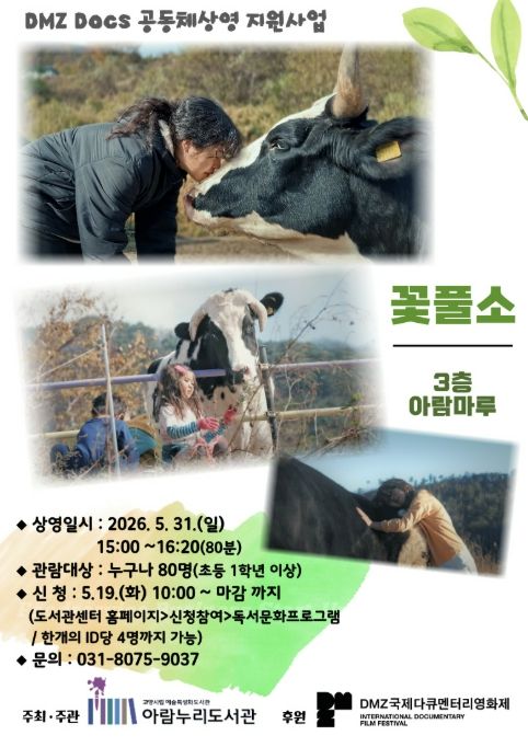 (중부시사신문) 고양특례시 아람누리도서관은 DMZ국제다큐멘터리영화제와 협업해 오는 5월 31일 오후 3시, 도서관 3층 아람마루에서 다큐멘터리 영화 ‘꽃풀소’ 상영회를 개최한다.