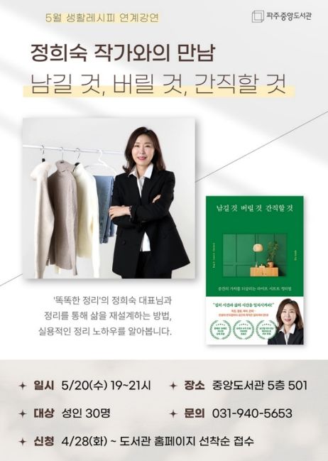 (중부시사신문) 파주시 중앙도서관은 오는 5월 20일 19시, 정리 전문가 정희숙 작가를 초청한 '남길 것, 버릴 것, 간직할 것' 강연을 개최한다.