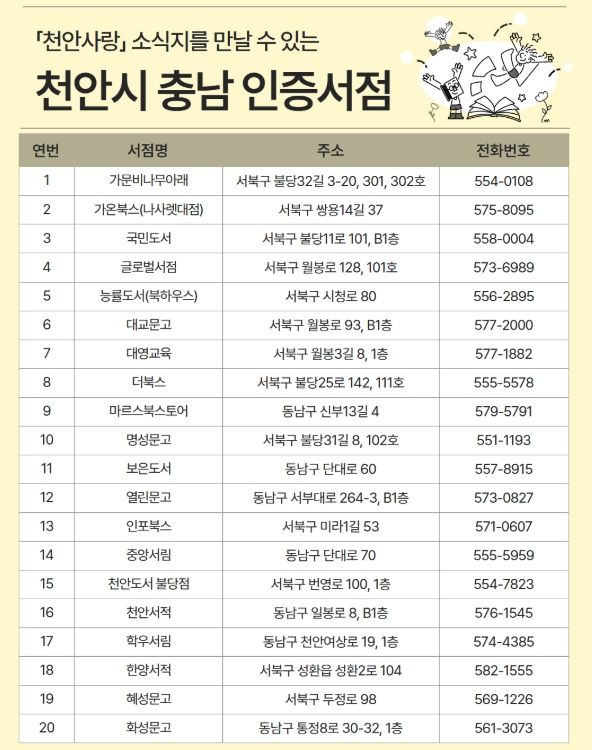 천안사랑이 비치된 서점 목록은 천안시 도서관 누리집에서 확인할 수 있다. 소식지는 카카오톡 채널 ‘천사통’과 모바일 앱으로 제공되며, 시청 누리집에서 우편 무료 구독 신청도 가능하다.