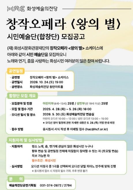 (중부시사신문) (재)화성시문화관광재단은 오는 10월 개최 예정인 창작오페라 '왕의 별' 쇼케이스 무대에 참여할 시민합창단을 모집한다.