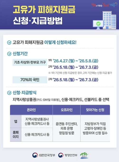 고유가 피해지원금은 1차로 4월 27일부터 5월 8일까지 취약계층을 대상으로 우선 지급하며, 2차는 기준 중위소득 70% 이하 가구를 대상으로 5월 18일부터 7월 3일까지 순차 지급한다.