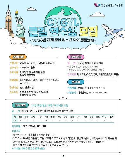 (중부시사신문) (재)충남평생교육진흥원은 도내 청소년들이 미국 현지에서 다양한 문화를 체험하고 자신의 진로를 탐색할 수 있도록'2026년 충남 청소년 해외 문화체험 큰길(CNGYL) 프로그램'하계 연수생을 모집한다.
