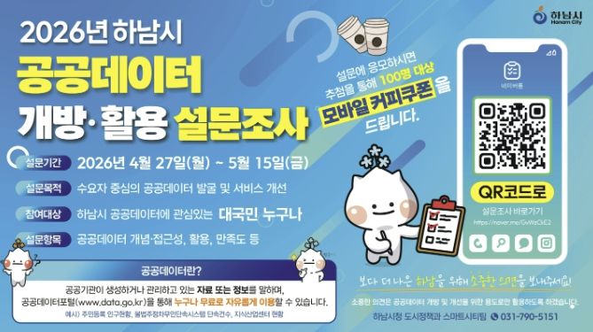 (중부시사신문) 하남시는 시민과 기업, 연구기관 등 다양한 수요자의 의견을 반영해 공공데이터 개방 및 활용을 확대하고자 ‘2026년 하남시 공공데이터 설문조사’를 실시한다고 밝혔다.