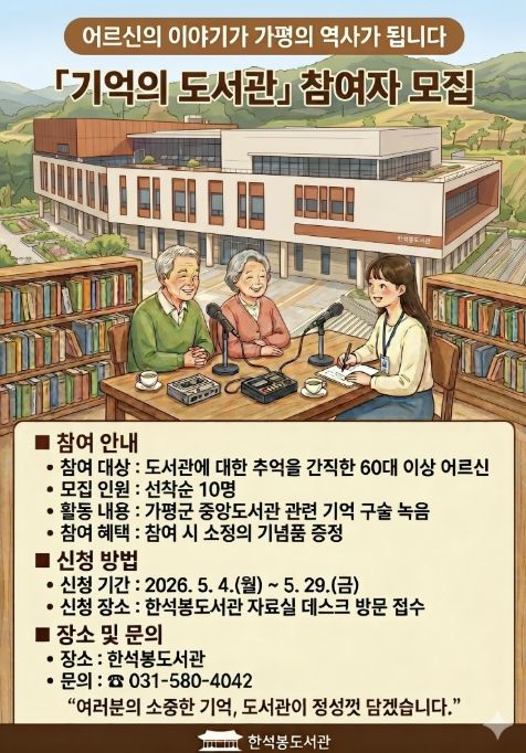 도서관은 오는 5월 4일부터 29일까지 가평군 중앙도서관과 관련된 추억을 간직한 60대 이상 어르신 10명을 선착순으로 모집한다. 참여를 희망하는 어르신은 한석봉도서관 자료실 데스크를 방문해 신청할 수 있으며, 참여 시 소정의 기념품이 제공된다.