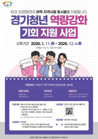 (중부시사신문) 이천시가 오는 5월 11일부터 미취업 청년의 어학·자격시험 응시료를 지원하는 ‘경기청년 역량강화 기회지원 사업’ 대상자 모집에 들어간다.
