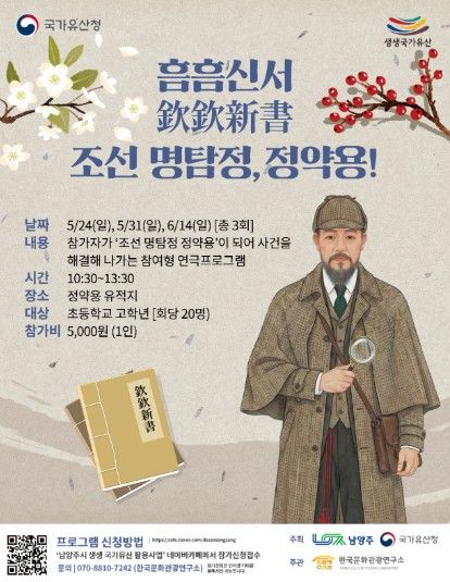 (중부시사신문) 남양주시는 오는 5월 24일과 31일, 6월 14일 정약용 유적지에서 초등학교 고학년을 대상으로 참여형 연극 프로그램 ‘흠흠신서: 조선 명탐정, 정약용!’ 참가자를 모집한다고 밝혔다.