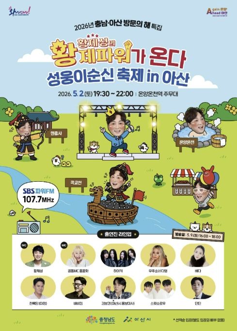 (중부시사신문) 인기 라디오 프로그램 SBS 파워FM ‘황제성의 황제파워’ 공개방송이 5월 2일 ‘제65회 아산 성웅 이순신축제’ 현장에서 열린다. 아산에서 라디오 공개방송이 열리는 것은 2013년 ‘대한민국 아산 온천대축제’ 이후 13년 만이다.