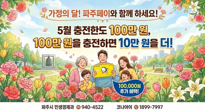(중부시사신문) 파주시는 5월 가정의 달을 맞아 5월 1일부터 5월 31일까지 한 달간 지역화폐 파주페이의 월 충전한도를 기존 70만 원에서 100만 원으로 상향한다.