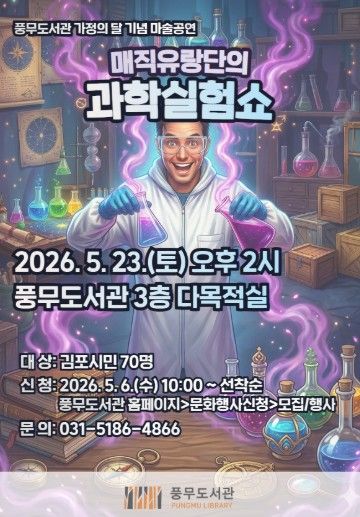 (중부시사신문) 김포시 풍무도서관에서는 5월 23일 오후 2시부터 3시까지 마술공연 ‘매직유랑단의 과학실험쇼’를 운영한다. 가정의 달을 맞아 도서관 이용 가족에게 특별한 문화 향유 기회를 제공하고자 기획된 공연이다.